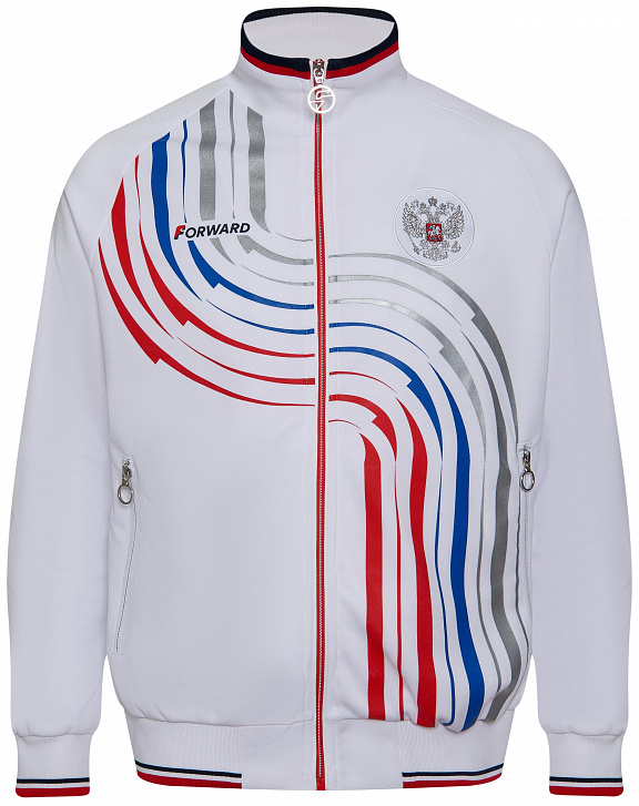 Куртка прямого силуэта на подкладке из сетки. Воротник стойка, внутреняя сторона из трикотажного полотна ластик. Полочка с центральной застежкой молнией. На полочках прорезные боковые карманы на молнии. Рукава покроя Реглан с отрезными манжетами из трикотажного полотна ластик. Низ изделия с поясом из трикотажного полотна ластик. Нанесения на куртке: Жаккардовый шеврон «Герб РФ», жаккардовый шеврон «Флаг РФ», принт «РОССИЯ, Мы Вместе. Спорт», принт «FORWARD», декоративный принт «Трек». Брюки слегка заужены. Боковые карманы в контсруктиных швах на тесьме молнии. Вдоль боковых швов декоративный принт. Пояс с эластичной тесьмой. Ширина пояса регулируется шнуром, вложенным внутрь. В боковых швах, по низу брюк выполнены разрезы с тесьмой молнией. Нанесения брюки: вышивка «FORWARD». Состав: ткань верха 100% полиэстер 250г/м², подкладка сетка: 100% полиэстер.