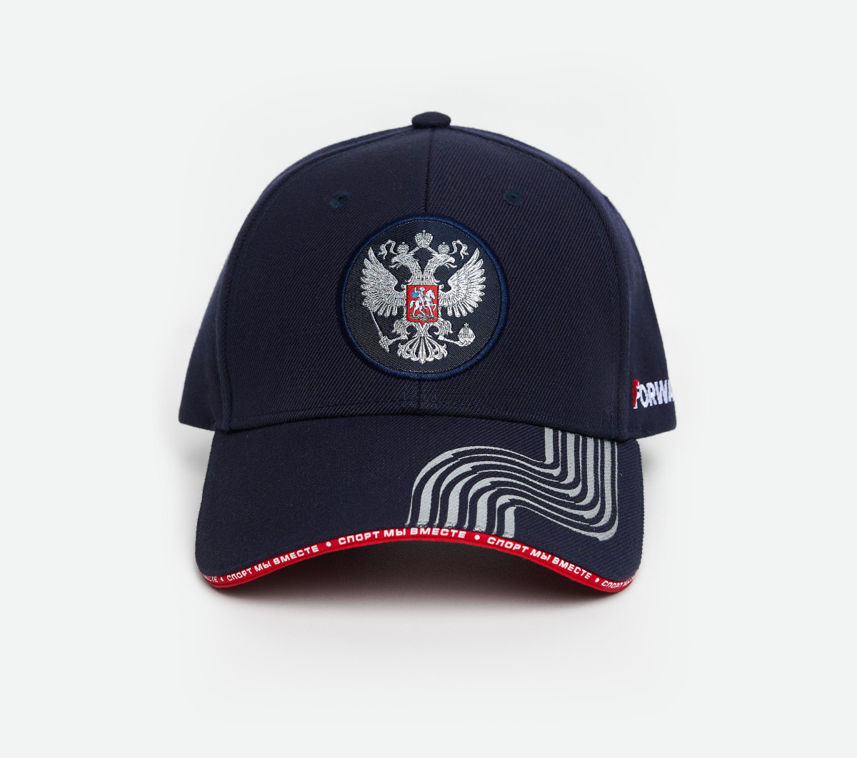 Бейсболка с жёстким козырьком. Для удобства в бейсболке предусмотрена застёжка с хлястиком и металлической пряжкой. Изготовлена из шести клиньев. Козырек выполнен с кантом. Нанесения: вышивка «FORWARD», жаккардовый шеврон «Герб РФ», принт на козырьке. Состав: 100% акрил.