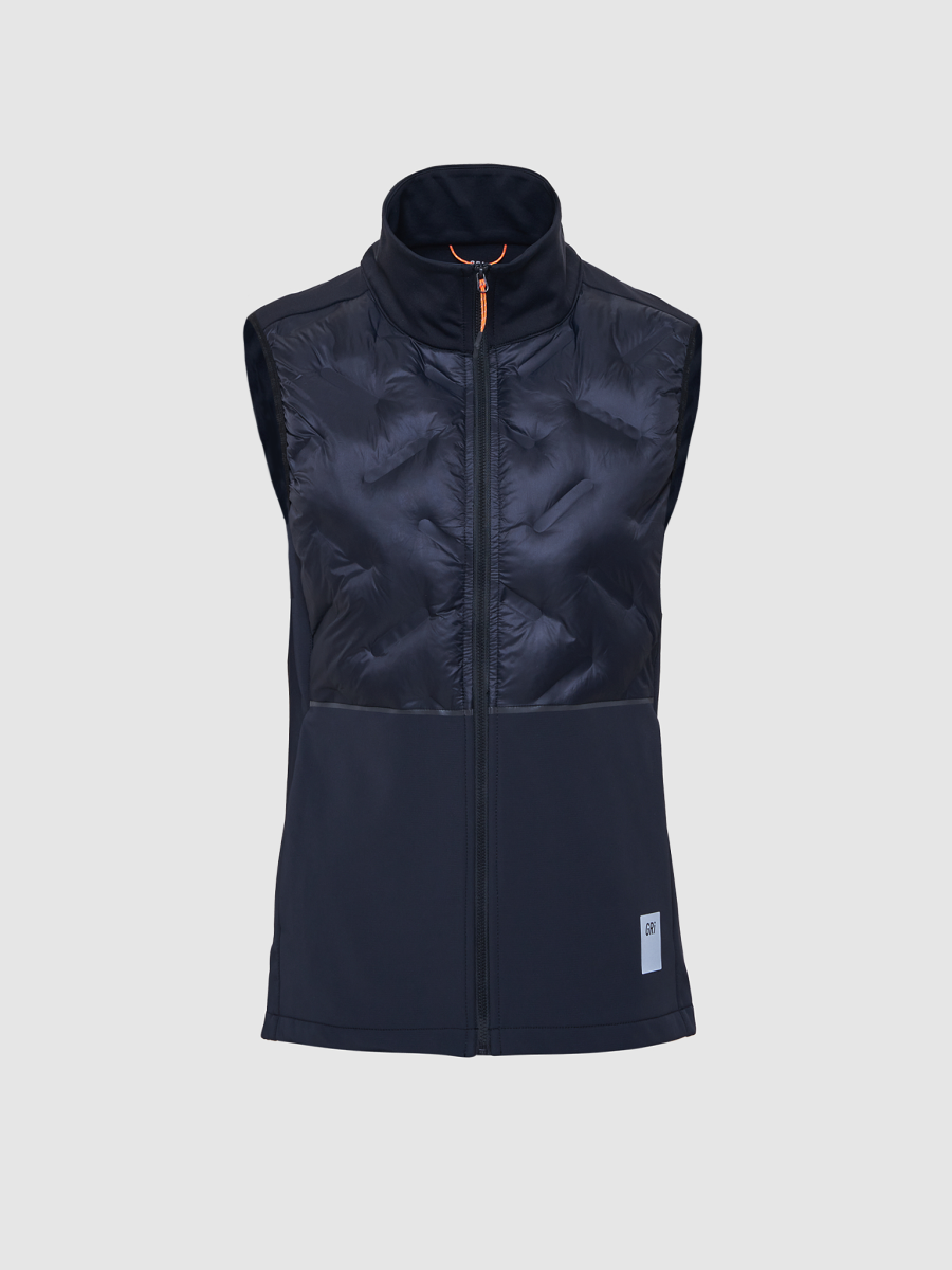 Новинка 2023 года. Подойдёт для зимних пробежек при температуре от –5 до –15°С как дополнительный верхний слой. Жилетка сшита из ткани с водоотталкивающей DWR-пропиткой, которая защитит от небольших осадков. Спереди модель утеплена синтетическим утеплителем и флисовым начёсом. Григорий Лазарев, основатель бренда GRI: «Я тестировал образец жилета Полар в прошлом сезоне и в полном восторге от него! Видимо, в этом сезоне тёплая зимняя куртка мне уже не понадобится». Основа: 75% нейлон, 25% спандекс. Вставки: 100% нейлон.