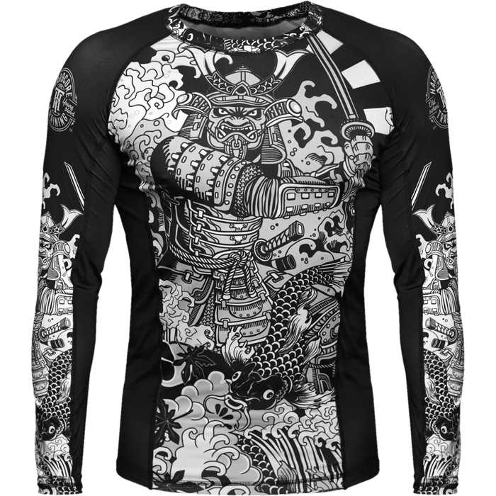 Рашгард Hardcore Training Koi 2.0. Шикарная новинка на самурайскую тему от НСТ. Сдержанный черно-белый дизайн, отличная графика и сплошной дзен. Все краски сублимированны в ткань, не сотрутся и не потускнеют со временем! Качественные плоские швы не натирают кожу. Длинный рукав уберегает кожу рук при работе в партере от травмирования об жесткие маты и татами. Ткань очень приятная на ощупь. Уход: машинная стирка в холодной воде, деликатный отжим, не отбеливать. Состав: полиэстер, спандекс. Страна производитель: Италия