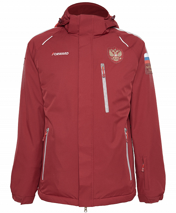 Куртка прямого силуэта с капюшоном, регулируемым по высоте и объему. Полочка с центральной застежкой на тесьму-молнию. В швах проймы и капюшона светоотражающие вставки. Рукава реглан, с внутренними манжетами и патами по низу. Боковые, нагрудный и карман на рукаве застегиваются на тесьму-молнию. Куртка с вентиляцией в области проймы, на тесьму-молнию. Куртка со снегозащитной юбкой. Ширина изделия по низу регулируется при помощи эластичного шнура и фиксаторов. Нанесения на куртке: жаккардовый шеврон «Герб РФ», жаккардовый шеврон «Флаг РФ, NATIONAL TEAM», принт «RUSSIA», вышивка «FORWARD», 3D вышивка «F», декоративный принт, светоотражающие элементы. Температурный режим: от +0°С до -15°С. Брюки прямого силуэта, с отстегивающимися и регулирующимися бретелями. Брюки с боковыми карманами на тесьме-молния. По низу брюк выполнены снегозащитные манжеты. Нанесения на брюках: принт «RUSSIA», вышивка «FORWARD», декоративный принт, светоотражающие элементы. Состав: ткань верха - 100% полиэстер, подкладка - 100% полиэстер, наполнитель - 100% полиэстер.