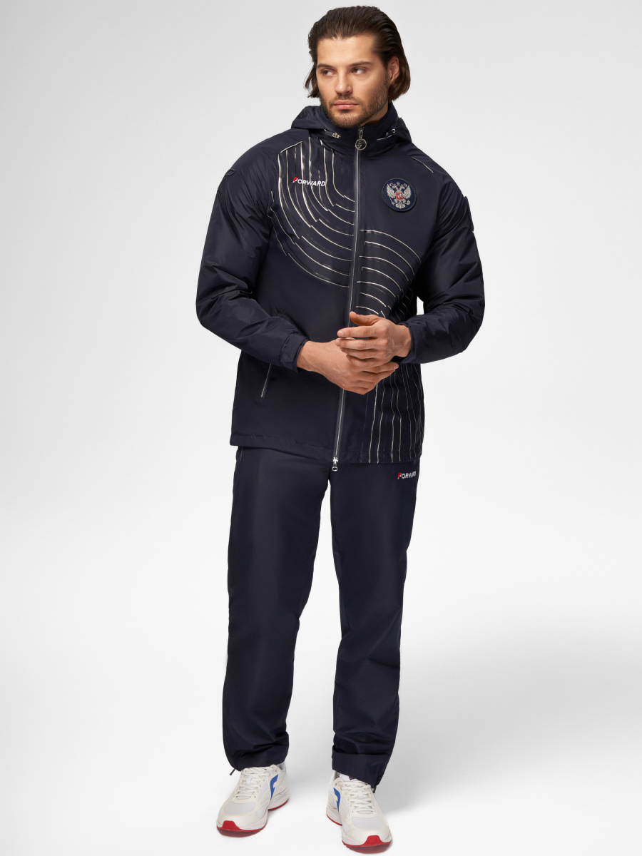 Куртка прямого силуэта на подкладке. Воротник стойка с карманом для капюшона на молнии. Полочка с центральной застежкой молнией. Боковые карманы прорезные с застежкой молнией. Рукава покроя Реглан с отрезными манжетами на эластичной тесьме и патами. Куртка с вентиляцией в области проймы на молнии. В швах проймы светоотражающие элементы. Низ изделия с эластичным шнуром и фиксаторами. Нанесения на куртке: Жаккардовый шеврон «Герб РФ», жаккардовый шеврон «Флаг РФ, RUSSIAN NATIONAL TEAM», вышивка «FORWARD», 3D вышивка «F», принт «Трек», принт «Мы вместе. Спорт». Брюки слегка заужены. Боковые карманы прорезные на молнии. На задних половинках брюк, под коленями, светоотражающие элементы. Пояс с эластичной тесьмой. Ширина пояса регулируется шнуром, вложенным внутрь. В боковых швах, по низу брюк выполнены разрезы с тесьмой молнией, шнуром и фиксаторами. Нанесения брюки: Вышивка «FORWARD», принт «Мы вместе. Спорт», принт «Трек». Состав: ткань верха 100% полиэстер, подкладка сетка: 100% полиэстер