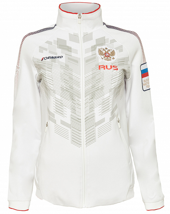 Куртка прямого силуэта на подкладке из сетки. Воротник-стойка выполнен из трикотажного полотна. Полочка с центральной застежкой-молнией. На полочках выполнены боковые карманы с застежкой-молнией. Спинка выполнена с отрезными боковыми деталями, формирующими силуэт изделия. Рукава покроя реглан с отрезными манжетами из трикотажного полотна ластик. Низ изделия с поясом из трикотажного полотна ластик. Нанесения на куртке: жаккардовый шеврон «Герб РФ», жаккардовый шеврон «Флаг РФ, NATIONAL TEAM», принт «RUS», принт «RUSSIA», вышивка «FORWARD», 3D вышивка «F», принт «Пиксельный Орел», декоративный принт. Брюки слегка заужены. Боковые карманы на тесьме-молнии. Брюки имеют боковые вставки с нанесением. Пояс с эластичной тесьмой. Ширина пояса регулируется шнуром, вложенным внутрь. В боковых швах, по низу брюк выполнены разрезы с тесьмой-молнией. Нанесения на брюках: принт «RUSSIA», вышивка «FORWARD», декоративный принт. Куртка прямого силуэта на подкладке из сетки. Воротник стойка выполнен из трикотажного полотна. Полочка с центральной застежкой молнией. На полочках выполнены боковые карманы с застежкой молнией. Спинка выполнена с отрезными боковыми деталями, формирующими силуэт изделия. Рукава покроя Реглан с манжетами из трикотажного полотна ластик. Низ изделия с поясом из трикотажного полотна ластик. Нанесения на куртке: Жаккардовый шеврон «Герб РФ», жаккардовый шеврон «Флаг РФ, NATIONAL TEAM», принт «RUS», принт «RUSSIA», вышивка «FORWARD», 3D вышивка «F», принт «Пиксельный Орел», декоративный принт. Брюки слегка заужены. Боковые карманы на тесьме молнии. Боковые вставки с нанесением. Пояс с эластичной тесьмой. Ширина пояса регулируется шнуром, вложенным внутрь. В боковых швах, по низу брюк выполнены разрезы с тесьмой молнией. Нанесения брюки: Принт «RUSSIA», вышивка «FORWARD», декоративный принт. Состав: ткань верха 66% вискоза, 29% нейлон, 5% эластан, 350 г/м², подкладка сетка: 100% полиэстер.