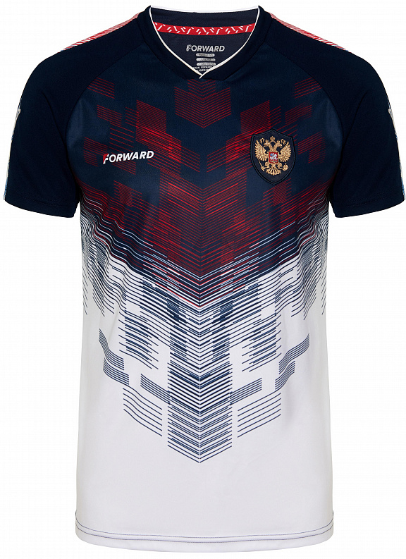 Мужская футболка с коротким рукавом в патриотичном цвете российского триколора. Прямой силуэт с V-образным вырезом горловины. Запринтованная полочка Спина и плечевые вставки из сетчатого полотна. Жаккардовый шеврон «Герб России» и вышивка «FORWARD», декоративный принт на груди , жаккардовый шеврон «Флаг России» и надпись «NATIONAL TEAM», 3D вышивка «F» на рукавах, принт «RUSSIA» на спине. Футболка выполнена из синтетического полотна с технологией Quick Dry. Это полотно отлично подходит для активного образа жизни, обладает водо- и грязеотталкивающими свойствами, быстро сохнет, имеет антистатические свойства. Футболка отлично отводит влагу и великолепно подходит для занятий спортом. Состав: 100% полиэстер, 135-145 г/м². Футболка прямого силуэта с V-образным вырезом горловины. Обтачка горловины выполнена из основного полотна. Рукав покроя реглан. Полочка запринтованая. Спинка и плечевые вставки выполнены из сетчатого полотна. Нанесения: Жаккардовый шеврон «Герб РФ», жаккардовый шеврон «Флаг РФ, NATIONAL TEAM», принт «RUSSIA», вышивка «FORWARD», 3D вышивка «F», декоративный принт. Состав: 100% полиэстер, 135-145г/м2.