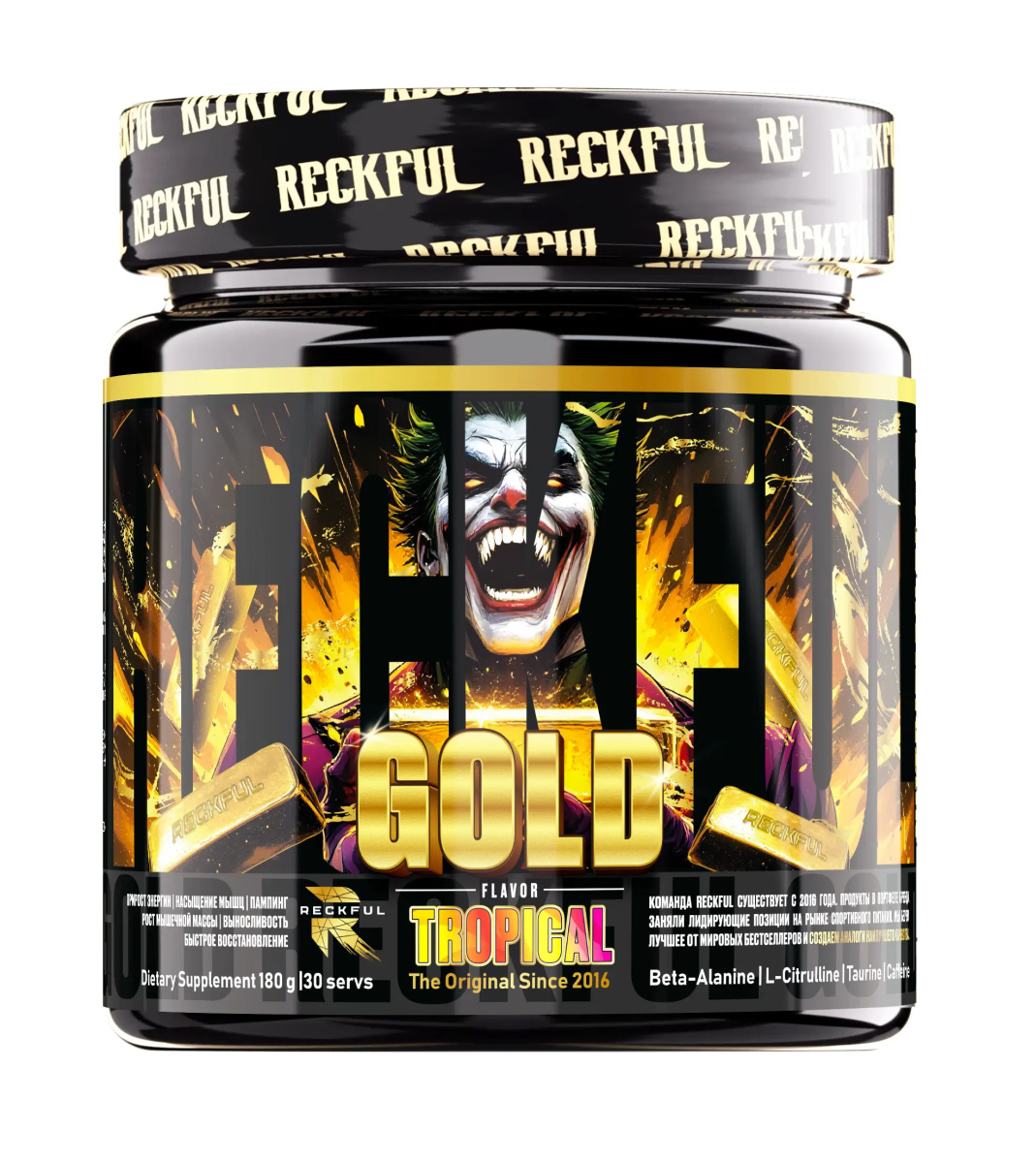RECKFUL Gold 30 Servings NEW DESIGN AND SUPP FACTS – это премиум-предтренировочный комплекс, созданный для максимальной эффективности тренировок. Новый дизайн и обновленная формула делают этот продукт неотъемлемой частью арсенала любого спортсмена. Особенности продукта: Тропический вкус: Сочная и освежающая комбинация экзотических фруктов наполняет каждую порцию наслаждением. Высокая эффективность: Комплекс активных компонентов поддерживает концентрацию, выносливость и энергичность на протяжении всей тренировки. Быстрое восстановление: Помогает снизить утомляемость, улучшить кровообращение и ускорить восстановление мышц. Ключевые преимущества: Максимальный фокус: Идеальный баланс стимуляторов поддерживает ясность ума и концентрацию даже во время самых интенсивных занятий. Энергия без перепадов: Длительное поддержание уровня энергии без ощущения "упадка" после тренировки. Поддержка силы и выносливости: Увеличение физической мощности благодаря продуманному сочетанию активных ингредиентов. Рекомендации по применению: Принимайте одну порцию (1 мерная ложка) за 20–30 минут до тренировки. Смешайте с водой или вашим любимым напитком. Позвольте RECKFUL Gold с тропическим вкусом стать вашим лучшим помощником на пути к результатам!