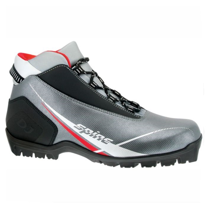 Серия, в которую входят эти ботинки, называется Touring. Модель построена на подошве для современных системных креплений SNS Profil (известные многим крепления «Саломон»). Целевое назначение: лыжные ботинки, начального уровня, катание преимущественно классическим стилем, предназначены для активного отдыха, неспешных лыжных прогулок по лесу. Часто данная модель используется для прокатов, на лыжных и туристических базах, в школах на занятиях физкультурой. Фиксация ноги осуществляется открытой шнуровкой. "Язык" - клапан для защиты от снега и влаги. Верх ботинка выполнен из высококачественного, синтетического морозостойкого материала с полиуретановым покрытием. На внешней боковой части ботинка, нанесен двухцветный фирменный узор и надпись SPINE. Улучшенная, с учетом анатомических особенностей ноги колодка ботинка - комфортная, средней полноты. Утеплитель - капровилюр. Двухкомпонентная стелька, низ выполнен из ППУ (эластичный, вспененный материал, за счет своей пористой структуры, хорошо удерживает тепло), а верх из капровилюра, материалы отлично сохраняют тепло ноги при спокойных размеренных прогулках по лесу. Состав подошвы - высокотехнологичный термопласт с увеличенным протектором для прогулок без лыж. Данная подошва позволяет передвигаться с комфортом от лыжни до автомобиля или по пути следования к месту отдыха и обратно. Условия эксплуатации до -30°С.