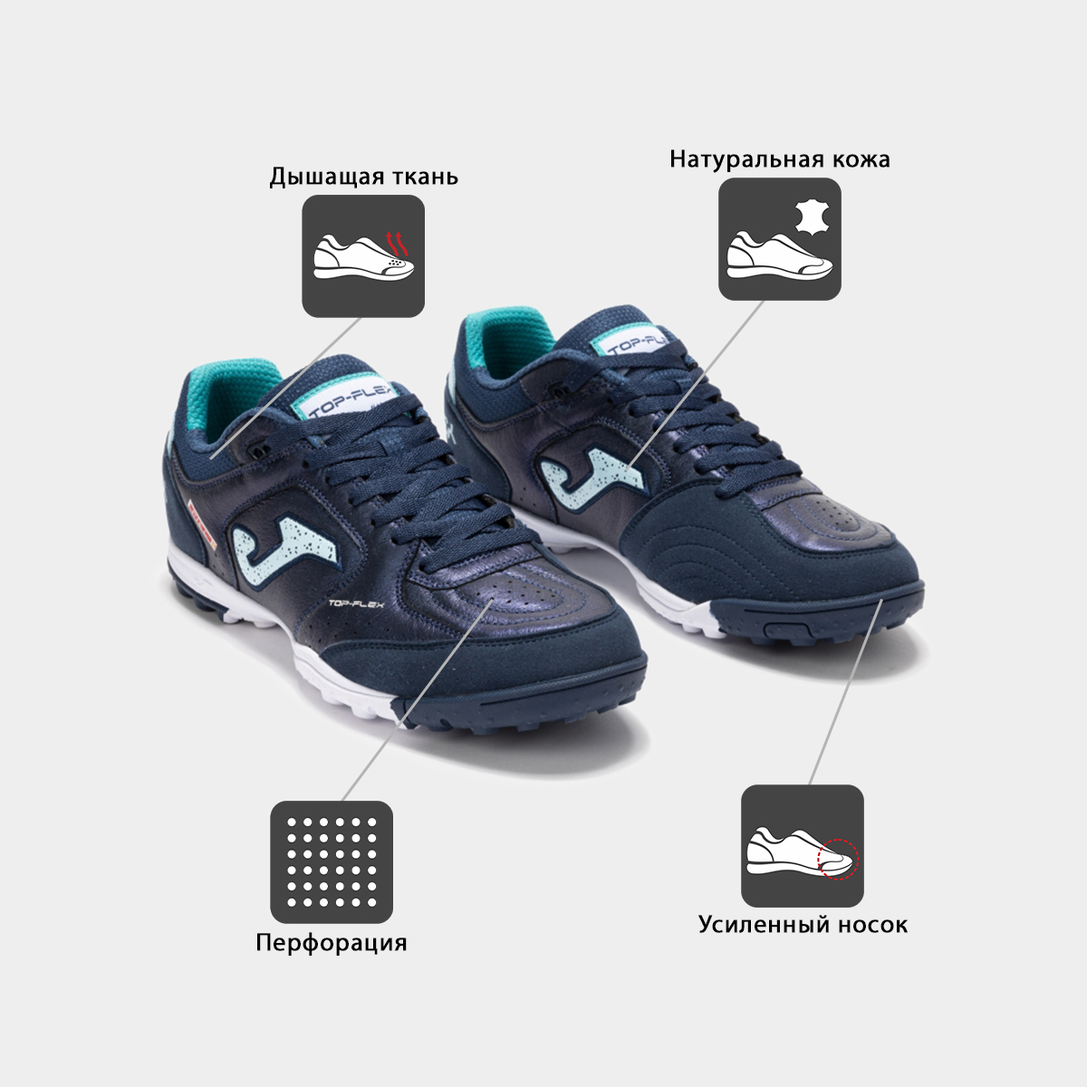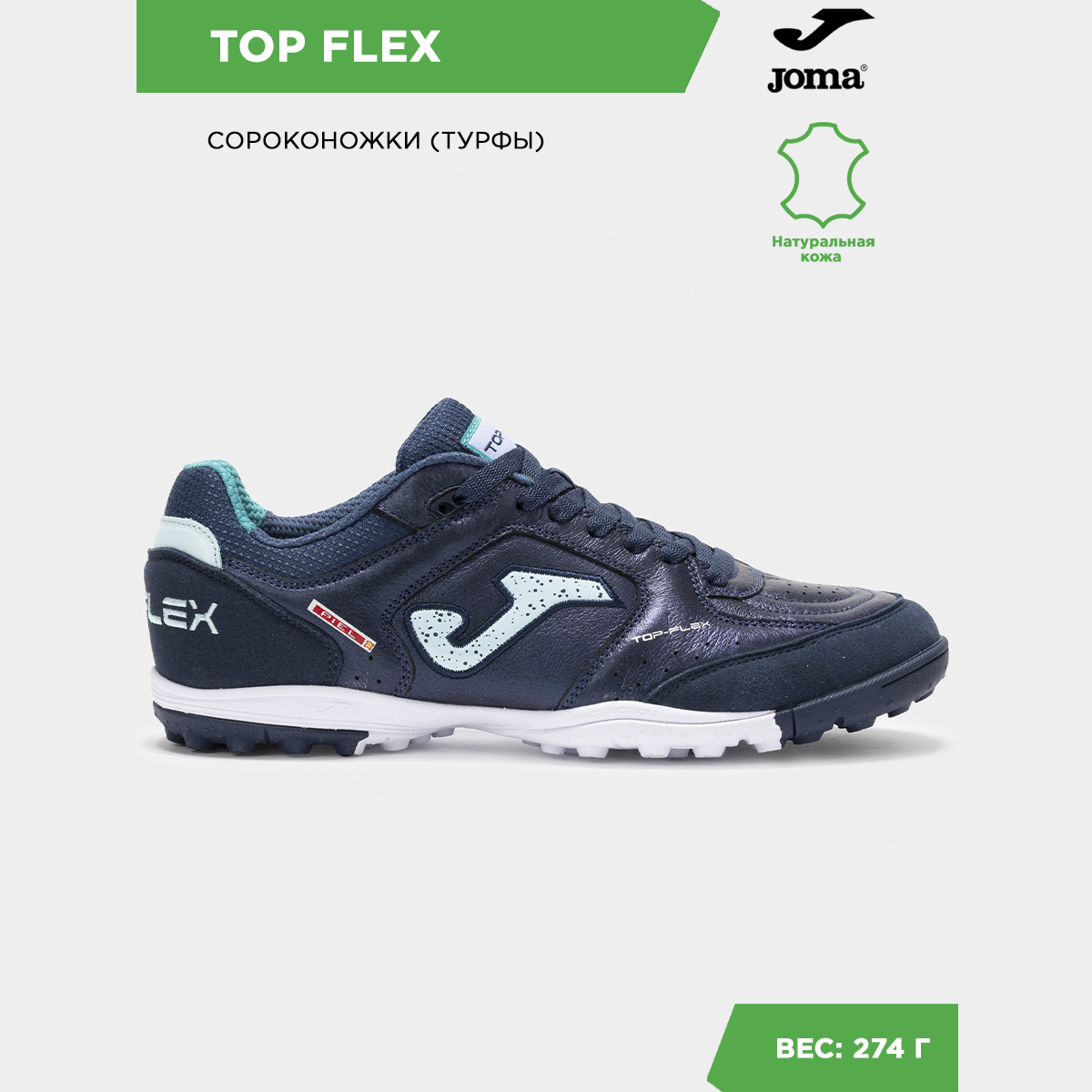 JOMA TOP FLEX — одна из самых известных моделей турфов (сороконожек), которую выбирают профессиональные футболисты. Верх турфов из прочной и очень гибкой кожи, которая обеспечивает контроль мяча и воздухопроницаемость. В тех местах обуви, где требуется дополнительная вентиляция, предусмотрена система VTS, способствующая воздухообмену. Для плотной посадки изнутри добавлен текстильный материал. В этой модели улучшена защита носка, а для усиления амортизации в промежуточной подошве использован современный синтетический материал филон. Подошва из износостойкой резины дольше сохраняет свои качества.