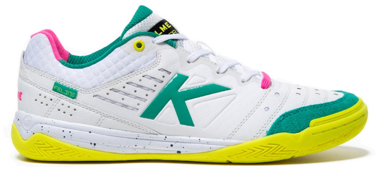 Футзалки Kelme Feline выполнены из легкого фирменного синтетического материала Hisking, напоминающего кожу. Перфорация обеспечивает доступ воздуха. Материал прочный и эластичный, отвечает за отличный контроль мяча и хорошую посадку стопы. Промежуточный слой подошвы выполнен из EVA, отвечающего за амортизацию. Подошва из износостойкой резины не оставляет следов на паркете и обеспечивает надежный контакт с поверхностью.