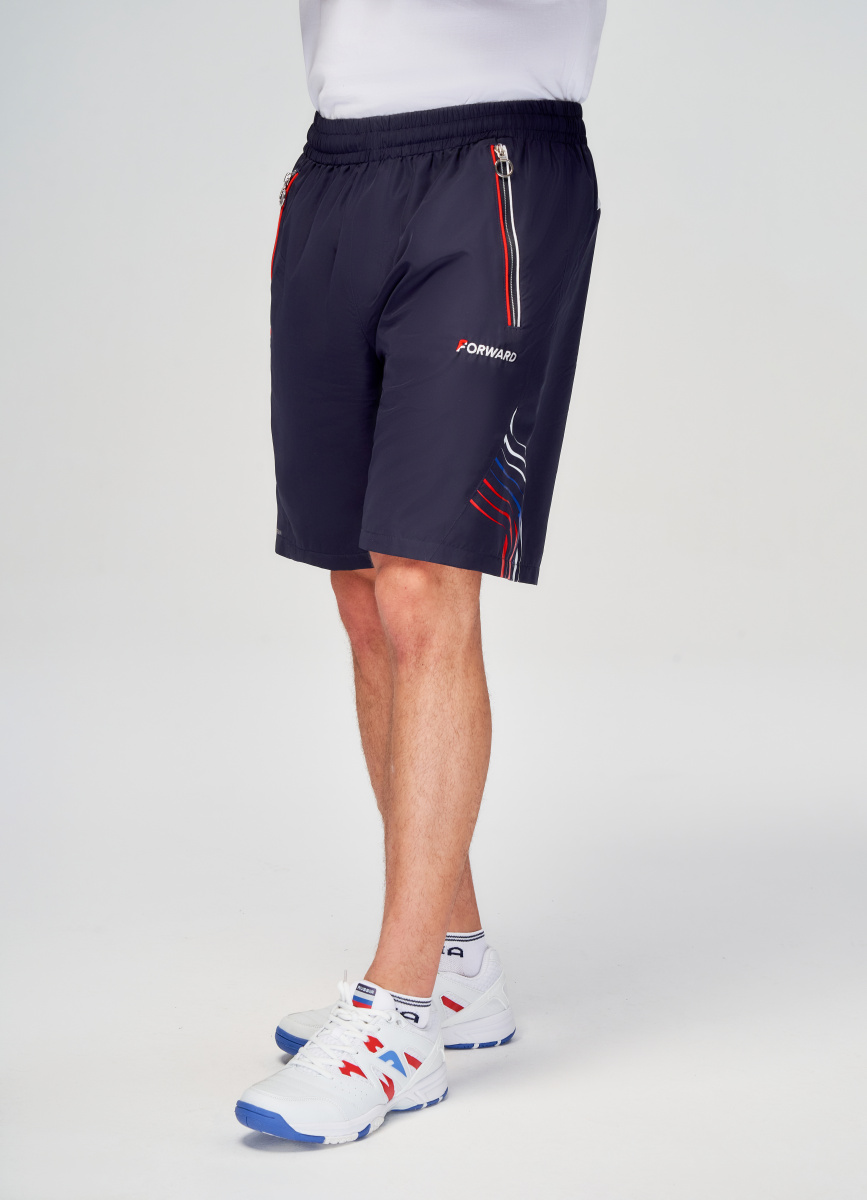 Шорты прямого силуэта без застежки, на подкладке из сетчатого трикотажного полотна. Пояс с эластичной тесьмой. Ширина пояса регулируется шнуром, вложенным внутрь. Боковые швы смещены на передние половинки. На задних половиках шорт кокетка из трикотажного сетчатого материала. Боковые карманы прорезные с тесьмой молнией. Нанесения: вышивка «FORWARD», принт «NATIONAL TEAM», принт «Трек». Состав: ткань верха 100% полиэстер, ткань отделки 100% полиэстер, сетка, подкладка 100% полиэстер, сетка.