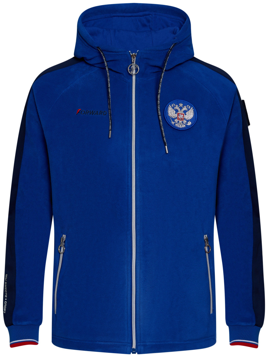 Куртка прямого силуэта с капюшоном. Полочка с центральной застежкой на тесьму молнию. Боковые карманы прорезные обработаны с тесьмой молнией. Капюшон регулируется по высоте с помощью шнурка. Рукава покроя реглан.На рукавах декоративные вставки из ламинированного флиса. Манжеты выполнены из трикотажного полотна ластик. Низ изделия регулируется при помощи эластичного шнура и фиксаторов. Нанесения на куртке: Жаккардовый шеврон «Герб РФ», жаккардовый шеврон«Флаг РФ+RUSSIAN NATIONAL TEAM», вышивка «FORWARD», вышивка «RUSSIA», принт «WINNER». Брюки слегка зауженного к низу силуэта. Боковые карманы прорезные, застегиваются на молнию. Вдоль боковых швов декоративныевставки из ламинированного флиса. Пояс с эластичной тесьмой. Ширина пояса регулируется шнуром, вставленным внутрь. Ширина по низу регулируется при помощи эластичного шнура и фиксаторов. Нанесения на брюках: вышивка «FORWARD», вышивка «RUS». Состав: ткань верха 100% полиэстер 240г/м², флис с двусторонним подчесом.