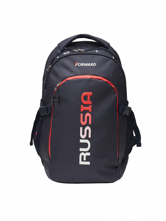 Рюкзак состоит из двух отделений, закрывающихся я на двухзамковую тесьму молнии. На передней части рюкзака накладной карман с на тесьме молнии. На боковых стенках выполнены карманы из сетки. В переднем накладном кармане выполнен внутренний карман-органайзер. Спинка и лямки продублированы мягким материалом с технологией "Air-mesh" для удобства эксплуатации и принятия анатомически удобной формы. Лямки регулируются по длине. Объем рюкзака 35 литров. ш*в*г 33*48*21см Нанесения: Жаккардовый шеврон «Флаг РФ», принт «NATIONAL TEAM», принт «RUSSIA», принт «FORWARD», вышивка «F». Состав: 100% полиэстер, подкладка 100% полиэстер.
