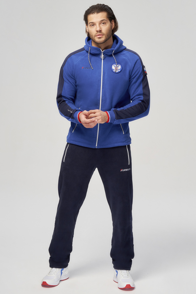 Куртка прямого силуэта с капюшоном. Полочка с центральной застежкой на тесьму молнию. Боковые карманы прорезные обработаны с тесьмой молнией. Капюшон регулируется по высоте с помощью шнурка. Рукава покроя реглан.На рукавах декоративные вставки из ламинированного флиса. Манжеты выполнены из трикотажного полотна ластик. Низ изделия регулируется при помощи эластичного шнура и фиксаторов. Нанесения на куртке: Жаккардовый шеврон «Герб РФ», жаккардовый шеврон«Флаг РФ+RUSSIAN NATIONAL TEAM», вышивка «FORWARD», вышивка «RUSSIA», принт «WINNER». Брюки слегка зауженного к низу силуэта. Боковые карманы прорезные, застегиваются на молнию. Вдоль боковых швов декоративныевставки из ламинированного флиса. Пояс с эластичной тесьмой. Ширина пояса регулируется шнуром, вставленным внутрь. Ширина по низу регулируется при помощи эластичного шнура и фиксаторов. Нанесения на брюках: вышивка «FORWARD», вышивка «RUS». Состав: ткань верха 100% полиэстер 240г/м², флис с двусторонним подчесом."