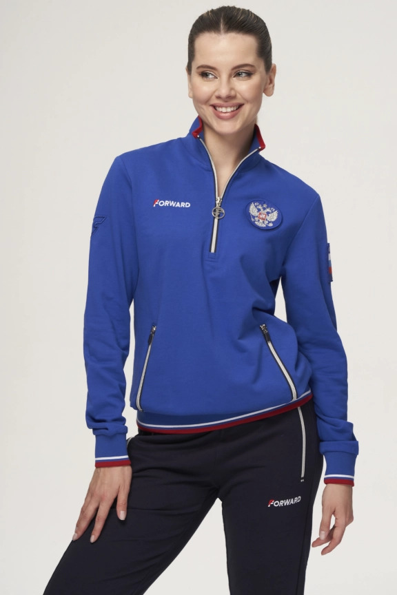 Куртка прямого силуэта. Полочка с центральной застежкой на тесьму молнию до уровня груди, с воротником стойка. Боковые крманы прорезные с входами на тесьме молнии. Рукава втачные. Воротник манжеты рукавов и низ изделия обработаны с трикотажным полотном ластик. Нанесения на куртке: Жаккардовый шеврон «Герб РФ», жаккардовый шеврон «Флаг РФ», вышивка «FORWARD», декоративный принт «Трек», принт «Мы вместе.Спорт». Брюки зауженного силуэта с боковыми, прорезными карманами на тесьму молнию. Пояс с эластичной тесьмой. Ширина пояса регулируется шнуром, вставленным внутрь. Низ брюк выполнен с манжетами из трикотажного полотна ластик. Нанесения брюки: вышивка «FORWARD», вышивка «Мы вместе.Спорт». Состав: 80% хлопок, 20% полиэстер, 290г/м².
