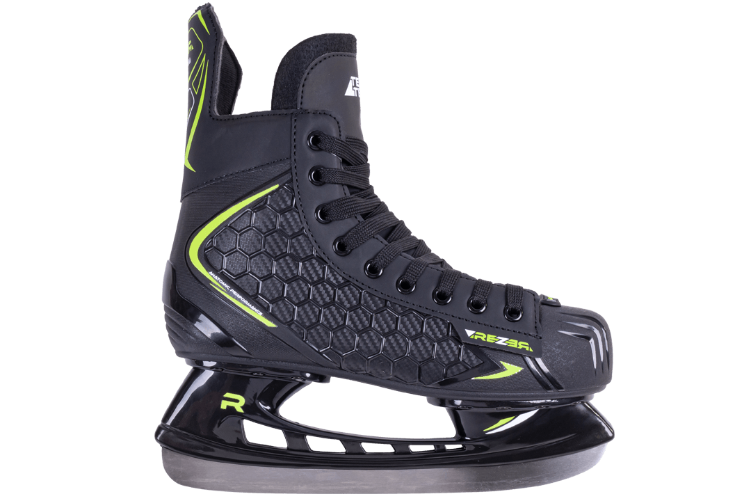 Верх ботинка - морозостойкая ударопрочная пластмасса Лайнинг - вельвет Подошва - пластмассовая Стакан - морозоустойчивая пластмасса Лезвие - нержавеющая сталь Застежка - шнурки Размерный ряд - 33 - 47 Ботинок Внутренний ботинок - несъемный Подкладка - синтетика Стелька - съемная Застежка - шнурки Лезвие Форма - хоккейное