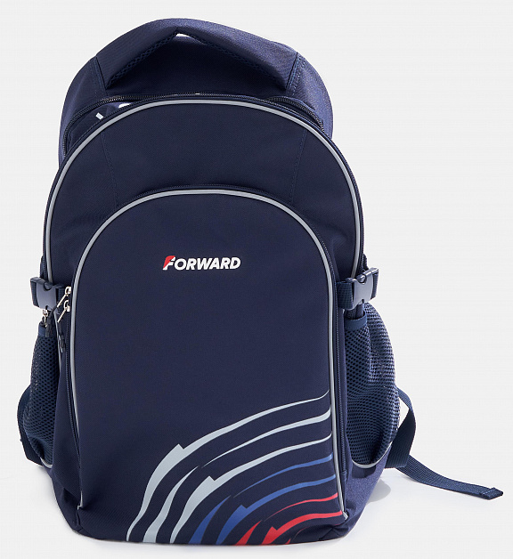 Рюкзак состоит из двух отделений, закрывающихся я на двухзамковую тесьму молнии. На передней части рюкзака накладной карман на тесьме молнии. На боковых стенках выполнены карманы из сетки. В переднем накладном кармане выполнен внутренний карман органайзер из сетки с застежкой молнией. Передний карман и фронтальное отделение выполнены со светоотражающим кантом. Спинка и лямки продублированы мягким материалом с технологией ""Air-mesh"" для удобства эксплуатации и принятия анатомически удобной формы. Лямки регулируются по длине. Объем рюкзака 35 литров. ш*в*г 33*48*21см Нанесения: принт «FORWARD», принт «Трек». Состав: 100% полиэстер, подкладка 100% полиэстер.