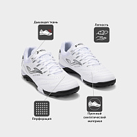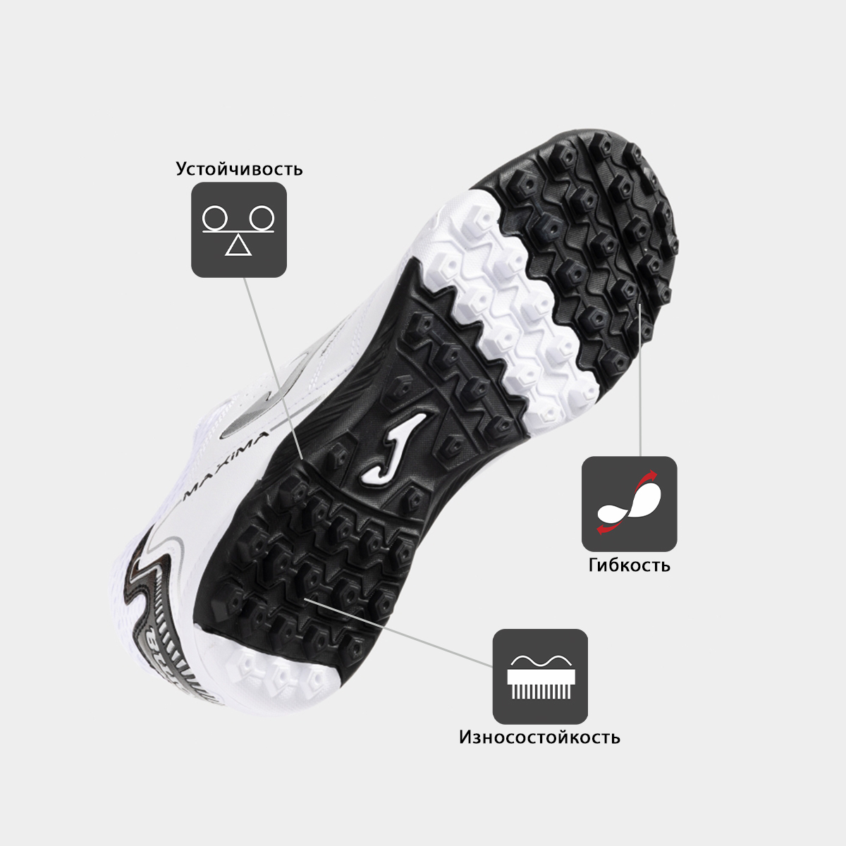 JOMA MAXIMA — турфы (сороконожки) из прочных материалов, что делает ее подходящей для полей с различными поверхностями. Верх изготовлен из высококачественного синтетического и текстильного материала с небольшими перфорациями, которые способствуют отведению излишнего тепла и влаги. Носок турфов усилен для улучшения износостойкости. Язычок и часть боковых поверхностей из легкого воздухопроницаемого материала, что обеспечивает большей комфорт и оптимальную посадку. Подошва из высококачественной резины DURABILITY, устойчивой к истиранию. Структуру ROTATION и гибки канавки на подошве облегчают повороты во время игры и гарантируют естественное движение стопы и гибкость бутс.