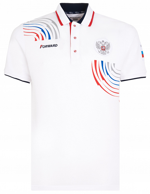 Рубашка Поло выполнена из трикотажного полотна пике, прямого силуэта. Полочка с застежкой планкой на три пуговицы. Рукава втачные с манжетами из трикотажного полотна ластик. В боковых швах по низу выполнены разрезы. Воротник выполнен из трикотажного полотна ластик. С изнаночной стороны спинки обтачка, настроченная на спинку. Нанесения: Жаккардовый шеврон «Герб РФ», жаккардовый шеврон «Флаг РФ», принт «Мы вместе. Спорт», вышивка «FORWARD», вышивка «F», принт «Трек». Состав: 100% хлопок 200г/м².