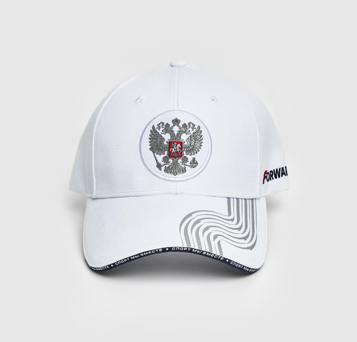Бейсболка с жёстким козырьком. Для удобства в бейсболке предусмотрена застёжка с хлястиком и металлической пряжкой. Изготовлена из шести клиньев. Козырек выполнен с кантом. Нанесения: вышивка «FORWARD», жаккардовый шеврон «Герб РФ», принт на козырьке. Состав: 100% акрил.